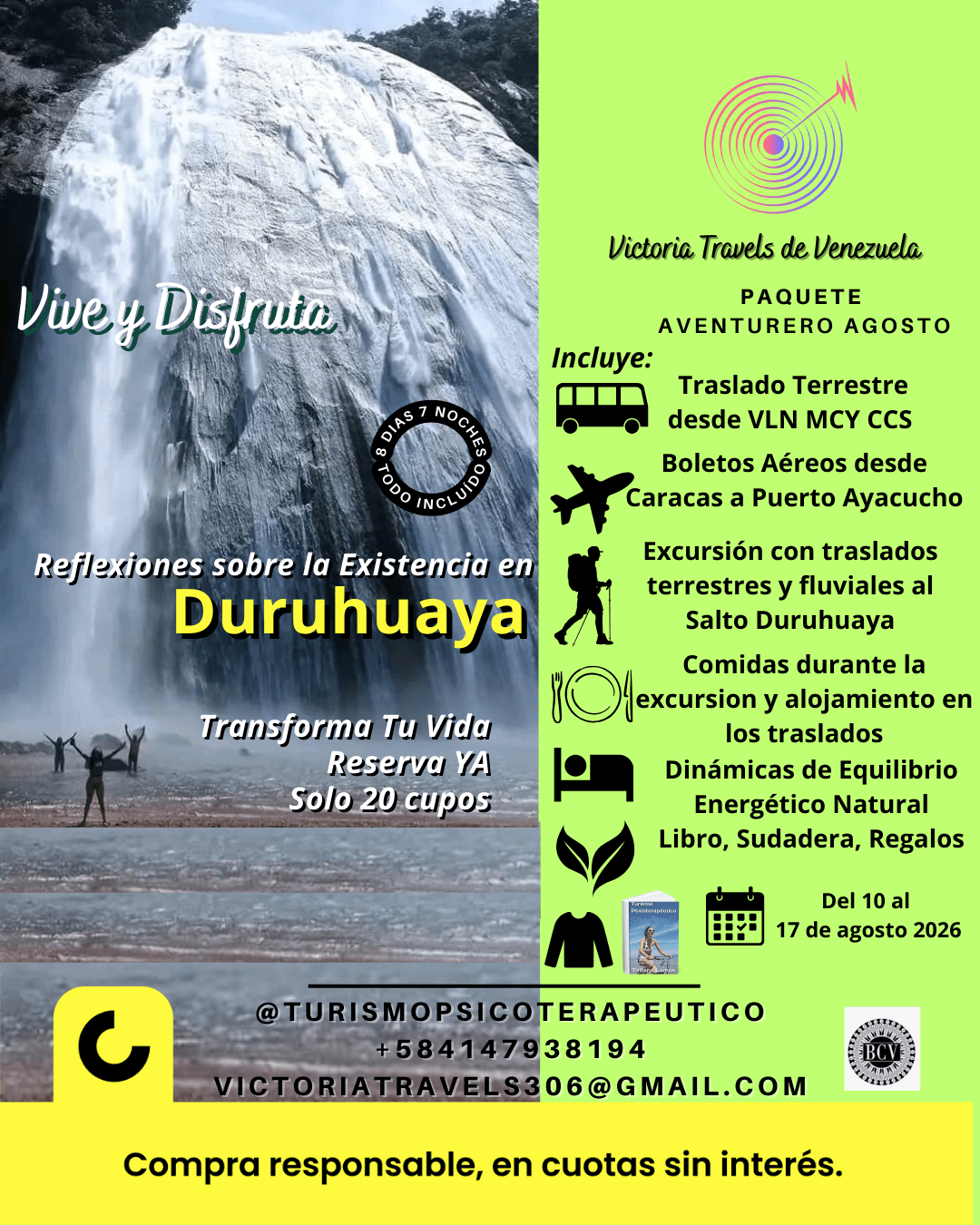 Por eso, hoy presento como agente turística venezolana una iniciativa que empezó en el año 2007 con mi primer viaje a Canaima Salto Ángel, que trata con un nuevo enfoque que reúne una actividad turística en un ambiente natural, experiencias de aventura o riesgo con las posibilidades de implementar estrategias psicológicas con dinámicas específicas.